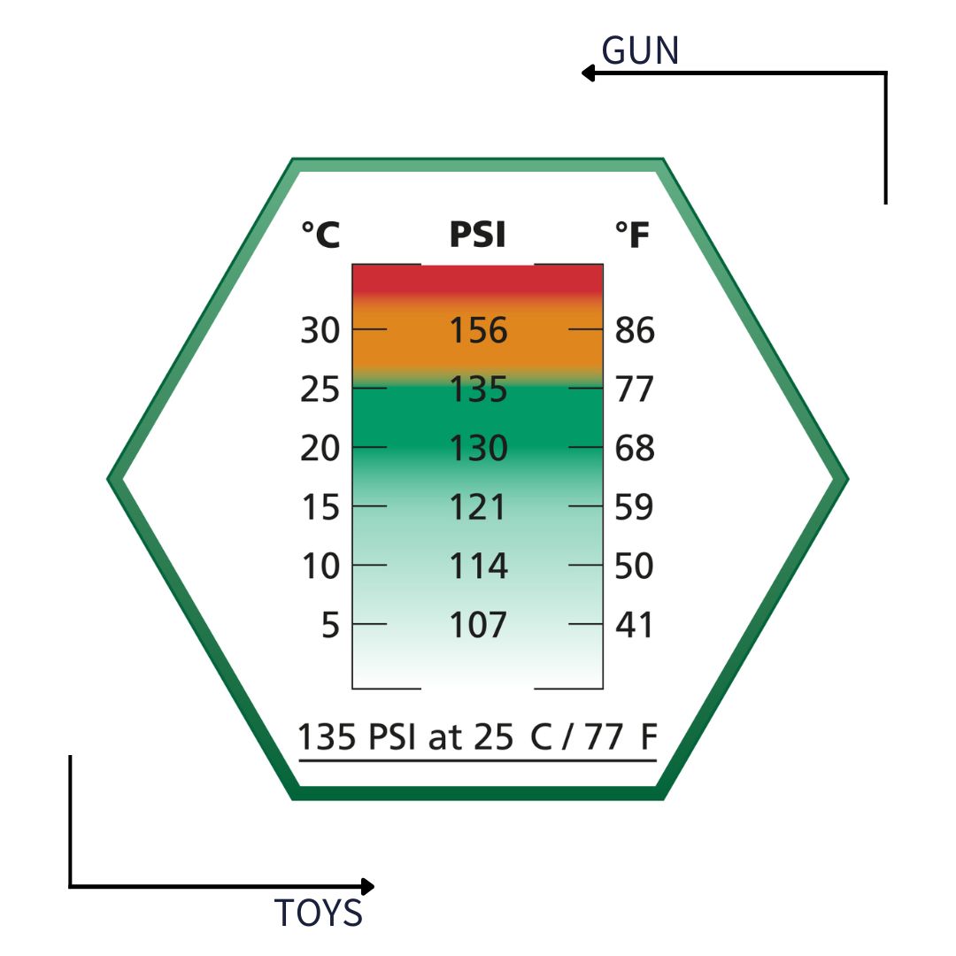此外,該產品還在 5°C、10°C、15°C、20°C 和 30°C 下進行了測試,您可以在瓶身背面的便利溫度-壓力對照表中找到測試結果。這有助於您根據季節、槍支類型和彈匣類型,為您的對抗遊戲選擇合適的氣體。